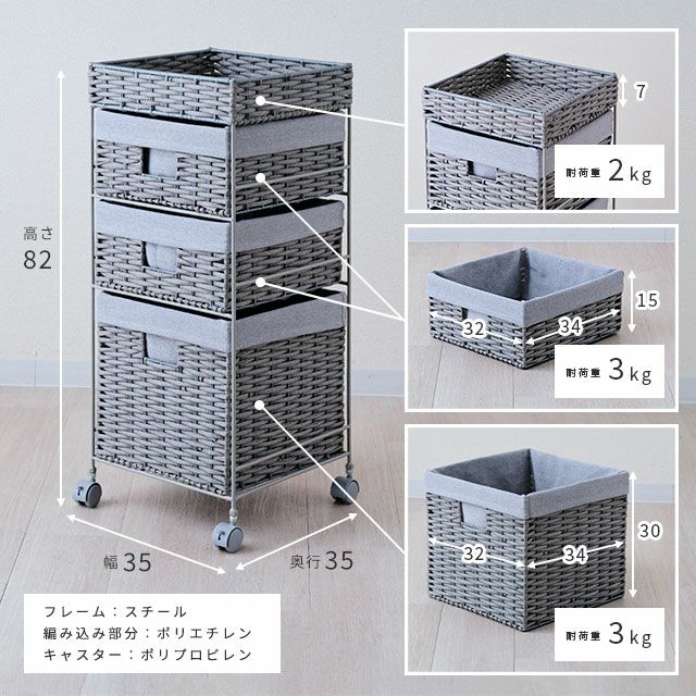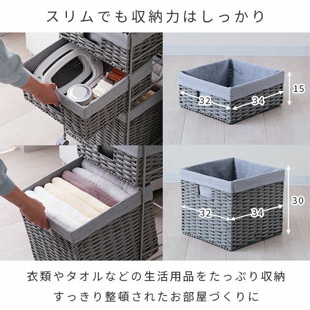 セット内容 | 本体×1、本体フレーム×1、ボックス×3、キャスター×4(ストッパー付き×2、ストッパーなし×2)、ナット×4(予備+1)、スパナ(キャスター用)×1、スパナ(ナット用)×1 |