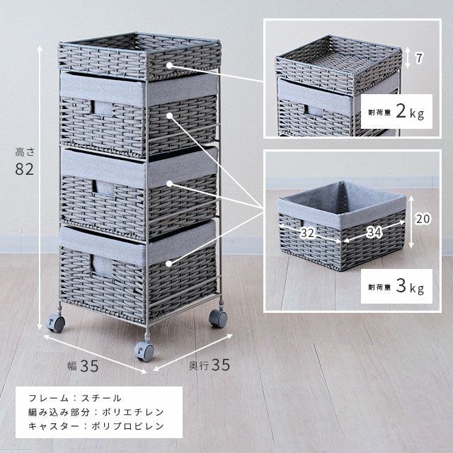 セット内容 | 本体×1、本体フレーム×1、ボックス×3、キャスター×4(ストッパー付き×2、ストッパーなし×2)、ナット×4(予備+1)、スパナ(キャスター用)×1、スパナ(ナット用)×1 |