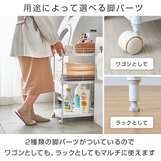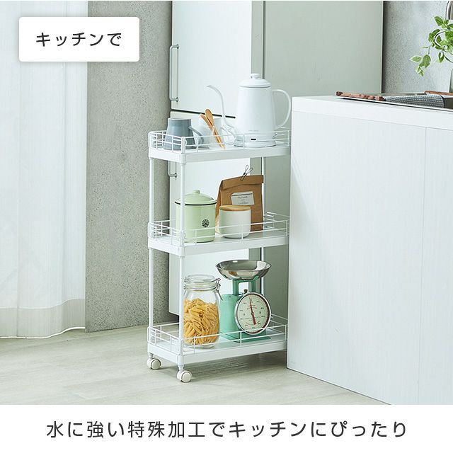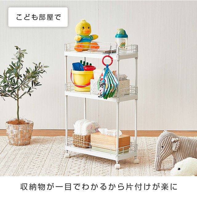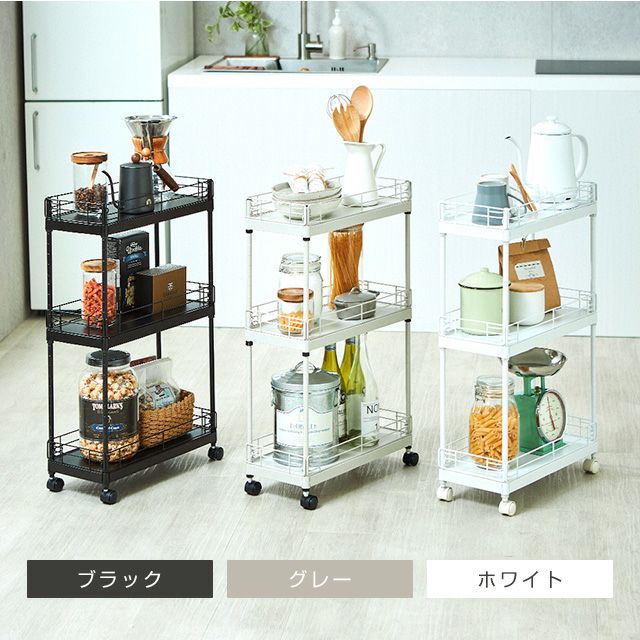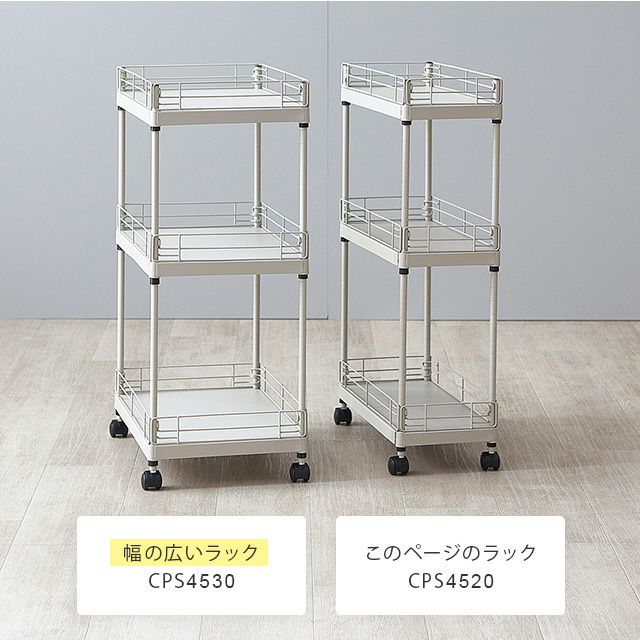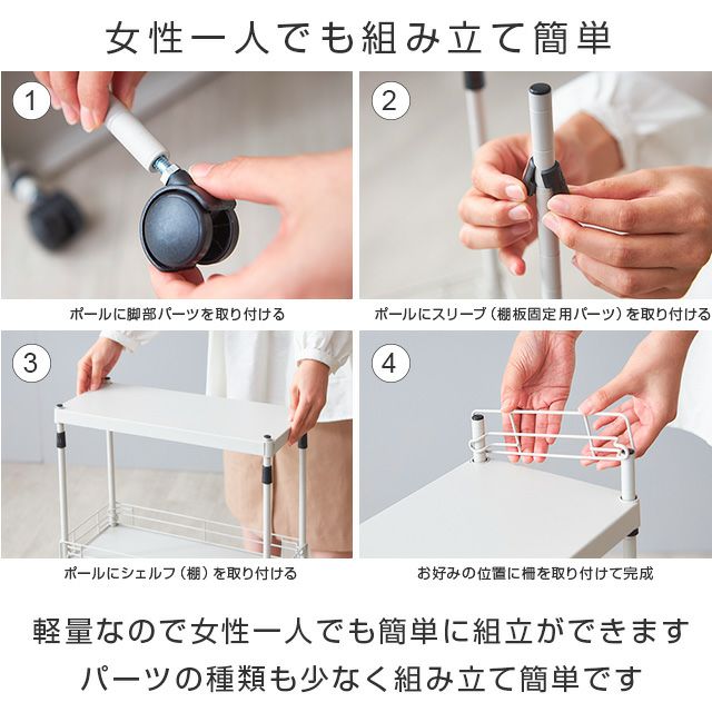シェルフ(棚板)×3、ポール(分割式)×4、スリーブ(取付部品)×12組(+予備1組)、キャスター(ストッパー無し)×4、アジャスター×4、サポート柵(20cm)×6、サポート柵(45cm)×6 |