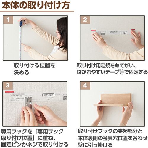 玄関横のスペースに設置しました。 ピンを押し込むには少し力が必要でしたが、ガイドもついていたのできれいに水平に取り付ける事が出来ました! 出来栄えは備え付けの棚みたいにしっかりしていて大満足です!!