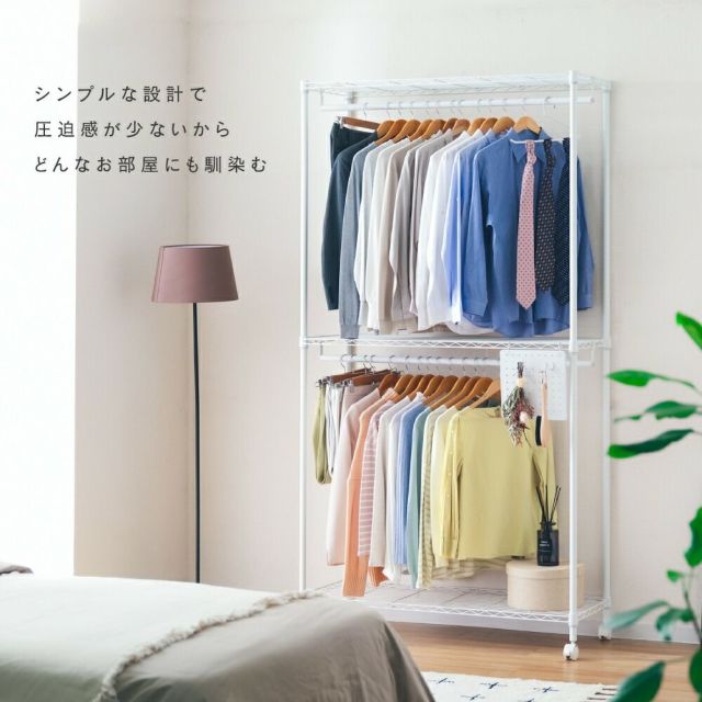 シェルフ×3枚、スリーブ×12組(+予備1組)、ポール(分割式)×各4本、アジャスター×4個、キャスター(ストッパー付)×2個、キャスター(ストッパー無し)×2個、スパナ×1個、ハンガーポールセット×2セット、S字フック×2個、有孔ボード×1枚