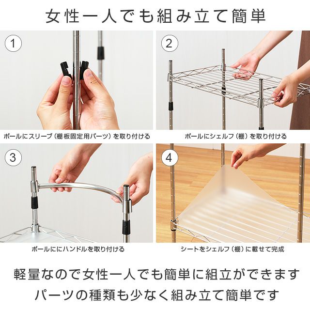木天板×1、シェルフ×3、上部ポール×2、下部ポール×2、PPシート×3、スリーブ×18組(+予備×1組)、ねじ(B)×2(+予備×1)、ハンドル×1、キャスター×4、スパナ×1、アジャスター×4