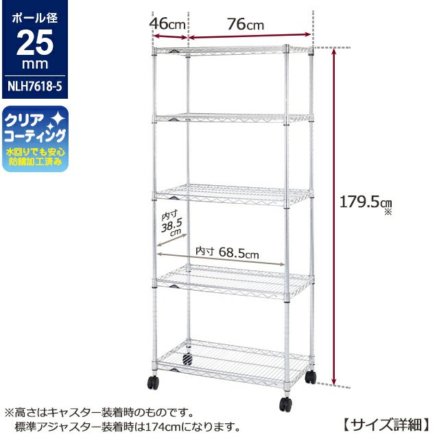| 外形寸法 | アジャスタ装着時:幅76×奥行46×高さ174cm キャスター装着時:幅76×奥行46×高さ179.5cm |