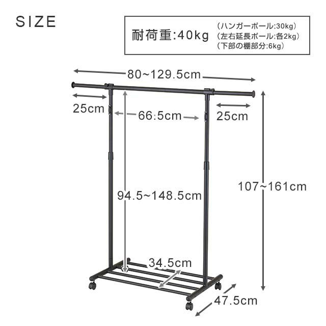 | 耐荷重(全体) | (約)全体40kg(ハンガーポール30kg、横延長ポール各2kg、下棚6kg) |