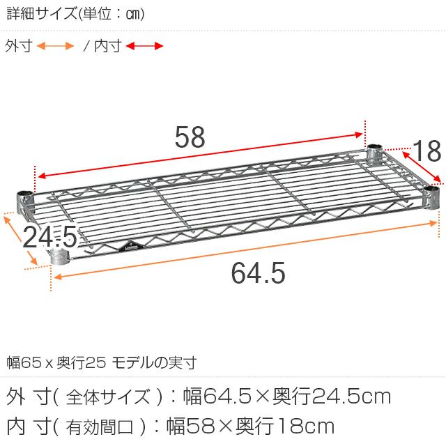 スチールシェルフ 幅64.5×奥行24.5cm ルミナスライト スチールラック パーツ ポール径19mm用 棚 幅65cm ST6525