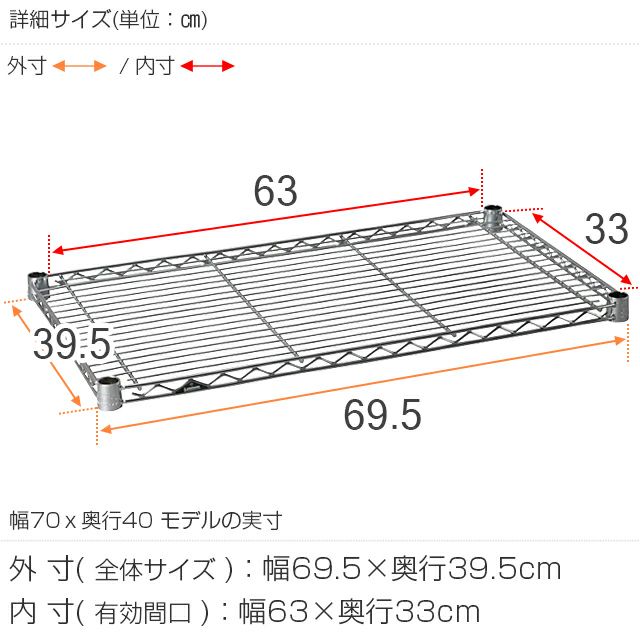 スチールシェルフ 幅69.5×奥行39.5cm ルミナスライト スチールラック パーツ ポール径19mm用 棚 幅70cm ST7040