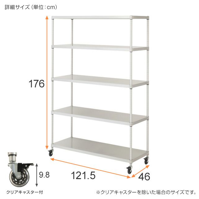 | セット内容 | スズメッキ ソリッドシェルフ(棚板)×5 スリーブ(棚板取付用部品)×20 スズメッキ ポール×4 クリアキャスター×4 |