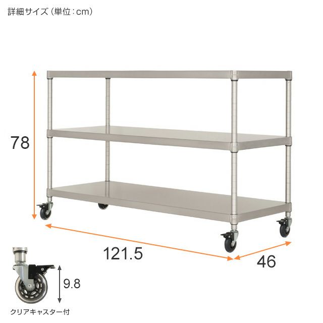スズメッキ ソリッドシェルフ(棚板)×3 スリーブ(棚板取付用部品)×12 スズメッキ ポール×4 クリアキャスター×4 |