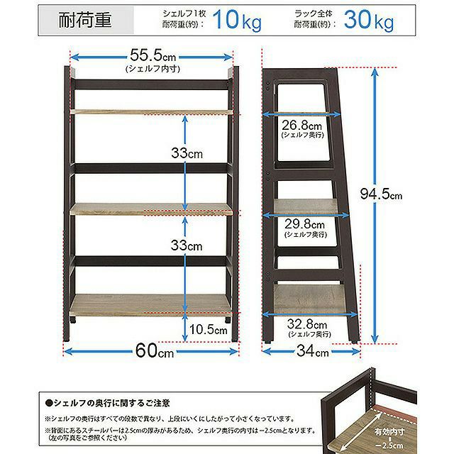 耐荷重(約) 全体:30kg/棚板一枚あたり:10kg