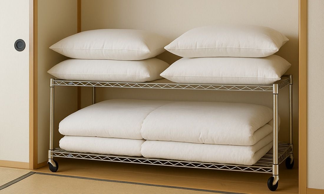 押し入れを、しまいやすく取り出しやすく。通気性に優れたスチールラックが湿気をためにくく、寝具や衣類を清潔に保ちます。キャスター付きで奥までスッと出し入れ。棚板は高耐荷重で布団や季節家電などの重量物も安心。限られた空間をムダなく活かし、入れ替えや掃除もラクに。