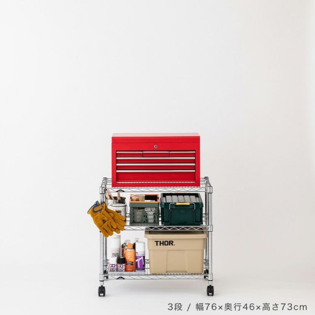セット内容 | スチールシェルフ(棚板)×3 スリーブ(棚板取付用部品)×14 ポール×4 ナイロンキャスター(ストッパー付)×2 ナイロンキャスター(ストッパーなし)×2 標準アジャスター×4 スパナ×1(キャスター取付用) |