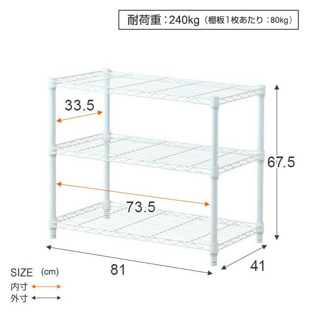 キッチンラック 幅80cm 3段 ルミナスラテ スチールラック ホワイト 幅81×奥行41×高さ67.5cm EHE8070-3WH