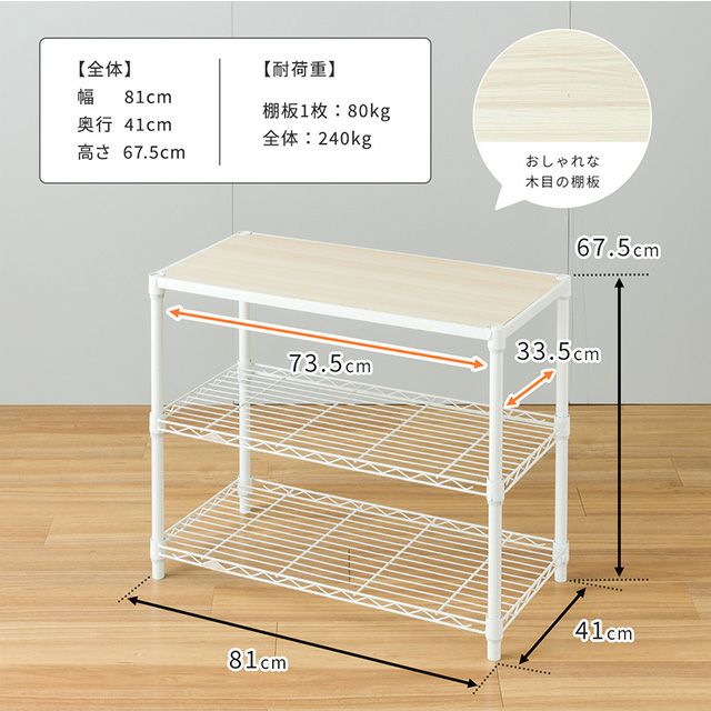 スチールラック 幅80cm 3段 ルミナスラテ 幅81×奥行41×高さ67.5cm LL8070-3WD