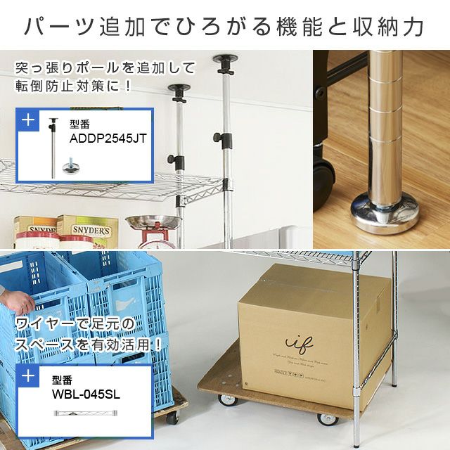 | 材質 | スチールシェルフ(棚板)・ポール:スチール(クロームメッキ) スリーブ:ABS樹脂 |