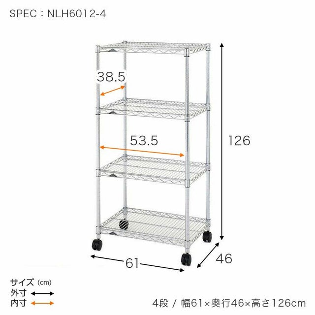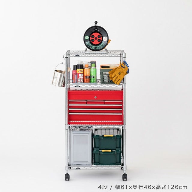 | セット内容 | スチールシェルフ(棚板)×4枚 スリーブ(棚板取付用部品)×18組 ポール×4本 ナイロンキャスター(ストッパー付)×2個 ナイロンキャスター(ストッパーなし)×2個 標準アジャスター×4個 スパナ×1個(キャスター取付用) |
