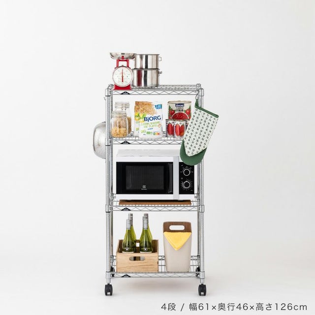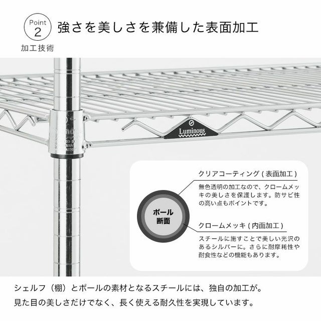 | 材質 | スチールシェルフ(棚板)・ポール:スチール(クロームメッキ) ナイロンキャスター:ナイロン樹脂 スリーブ:ABS樹脂 |