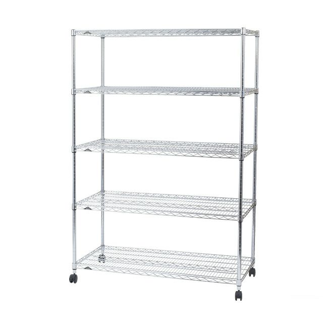 セット内容 | スチールシェルフ(棚板)×5枚 スリーブ(棚板取付用部品)×20組 ポール×4本 ナイロンキャスター(ストッパー付)×2個 ナイロンキャスター(ストッパーなし)×2個 標準アジャスター×4個 スパナ×2個(キャスター取付用) |