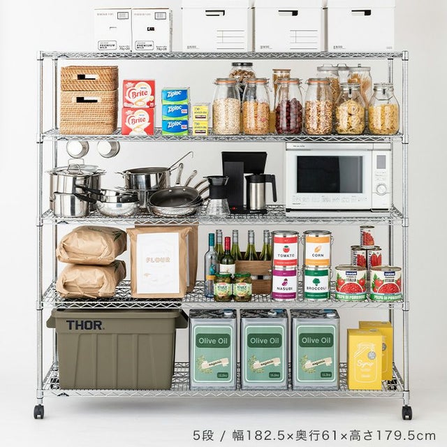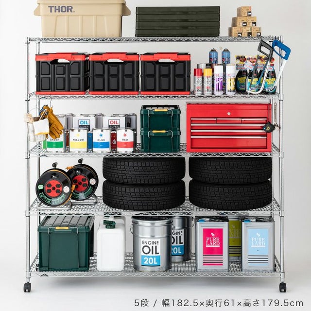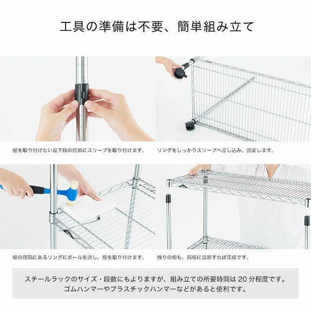 | セット内容 | スチールシェルフ(棚板)×5枚 スリーブ(棚板取付用部品)×20組 ポール×4本 ナイロンキャスター(ストッパー付)×2個 ナイロンキャスター(ストッパーなし)×2個 標準アジャスター×4個 スパナ×2個(キャスター取付用) |