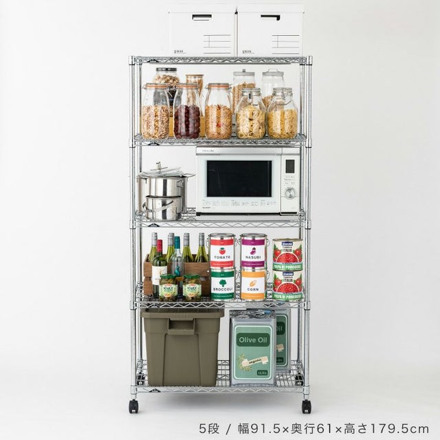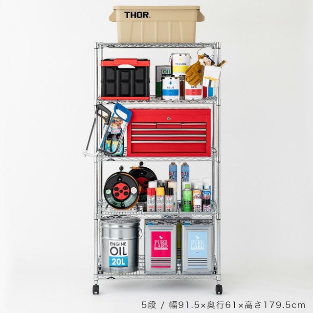 | セット内容 | スチールシェルフ(棚板)×5枚 スリーブ(棚板取付用部品)×20組 ポール×4本 ナイロンキャスター(ストッパー付)×2個 ナイロンキャスター(ストッパーなし)×2個 標準アジャスター×4個 スパナ×2個(キャスター取付用) |