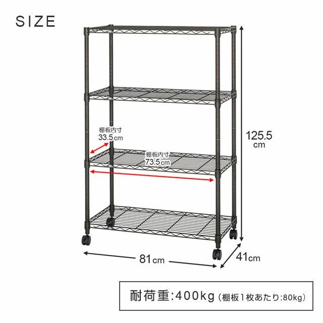 | セット内容 | スチールシェルフ(棚板)×4枚 スリーブ(棚板取付用部品)×18組 ポール×4本 ナイロンキャスター(ストッパー付)×2個 ナイロンキャスター(ストッパーなし)×2個 標準アジャスター×4個 スパナ×1個(キャスター取付用) |