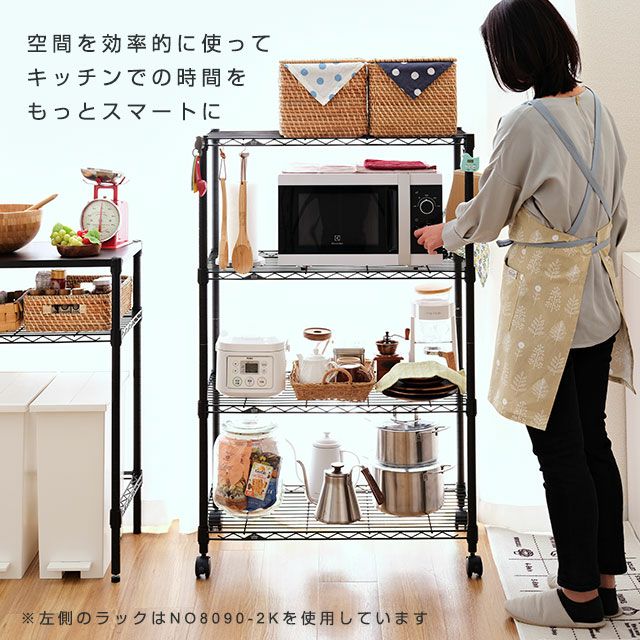 | 材質 | スチールシェルフ(棚板)・ポール:スチール(ハンマートーン塗装) ナイロンキャスター:ナイロン樹脂 スリーブ:ABS樹脂 |