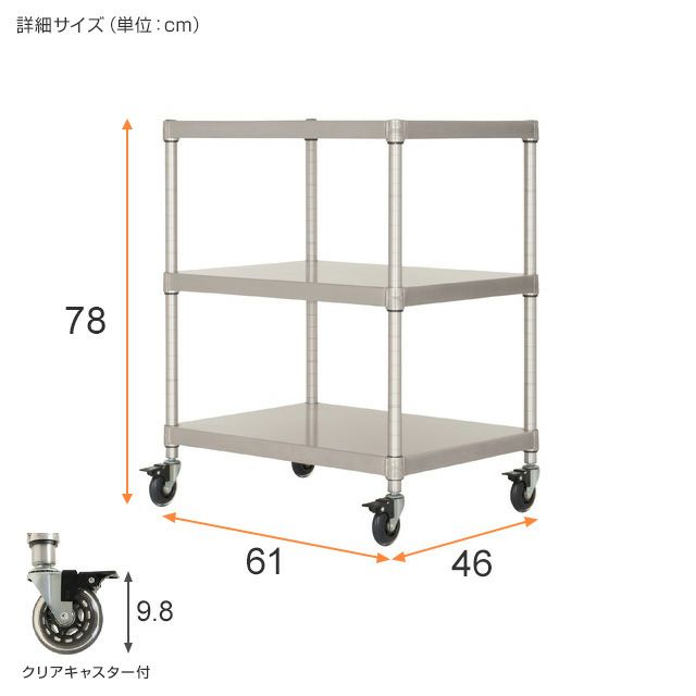 スズメッキ ソリッドシェルフ(棚板)×3 スリーブ(棚板取付用部品)×12 スズメッキ ポール×4 クリアキャスター×4 |