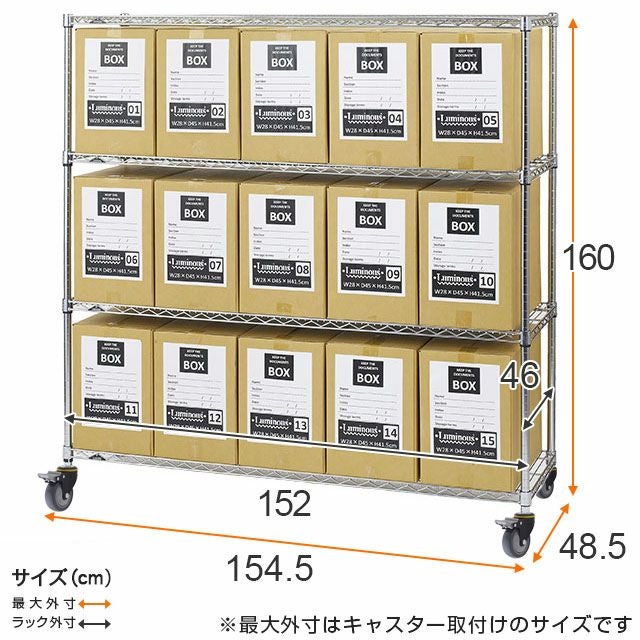 他の画像を見る 交換保証対象品 送料無料 ネット限定 ルミナスレギュラー 幅154.5cm 奥行48.5cm 高さ161cm NLH1515-4GYN2 スチールラック 幅150cm 4段 ルミナスレギュラー 高荷重ウレタンキャスター 幅154.5×奥行48.5×高さ161cm NLH1515-4GYN2 ¥ 40,560 税込