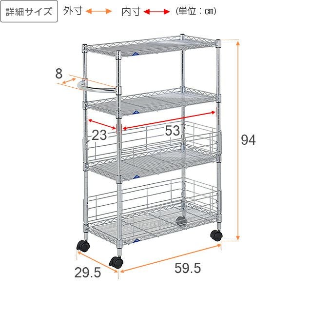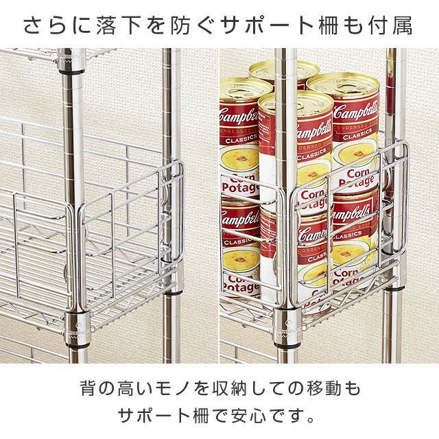 シェルフ、ポール、ハンドル、サポート柵(大、小):スチール(クロームメッキ) スリーブ:ABS樹脂 キャスター:ナイロン樹脂 |