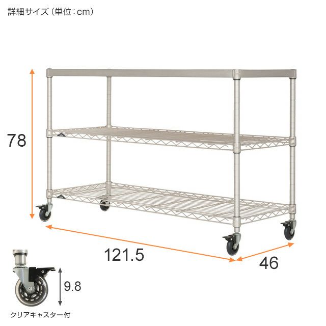 スズメッキ ワイヤーシェルフ(棚板)×2 スズメッキ ソリッドシェルフ(棚板)×1 スリーブ(棚板取付用部品)×12 スズメッキ ポール×4 クリアキャスター×4 |