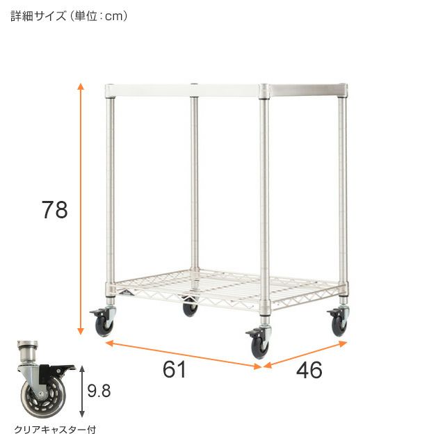スチールシェルフ(棚板):スチール ポール:スチール キャスター車輪部:ポリウレタン スリーブ:ABS樹脂 |