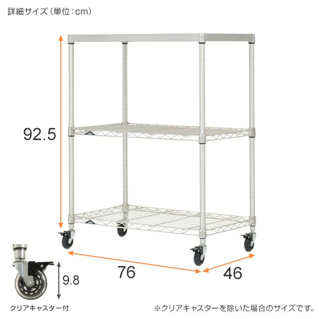 | セット内容 | スズメッキ ワイヤーシェルフ(棚板)×2 スズメッキ ソリッドシェルフ(棚板)×1 スリーブ(棚板取付用部品)×12 スズメッキ ポール×4 クリアキャスター×4 |