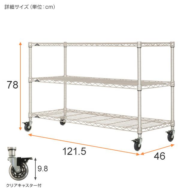 スズメッキ ワイヤーシェルフ(棚板)×3 スリーブ(棚板取付用部品)×12 スズメッキ ポール×4 クリアキャスター×4 |