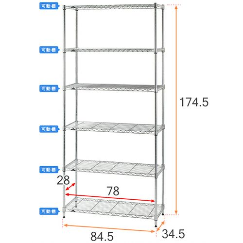 | セット内容 | スチールシェルフ(棚板)×6枚 ポール(分割式)×4本 延長用テンションポール×4本 スリーブ(棚板取付用部品)×24個 円形アジャスター×4個 |