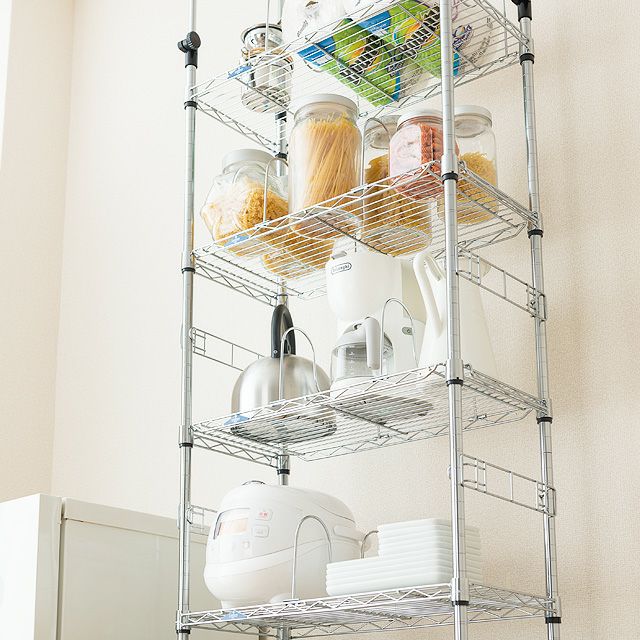 シェルフ、ポール、サポート柵、ディバイダ:スチール(クロームメッキ) スリーブ:ABS樹脂円形 アジャスター:表面 スチール(クロームメッキ) 設置面ポリプロピレン テンション部分:ポリプロピレン、ABS樹脂 |