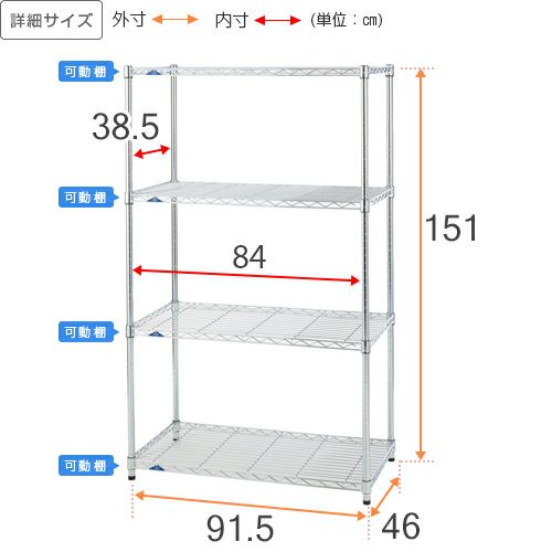 | 外形寸法 | アジャスタ装着時:幅91.5×奥行46×高151cm キャスター装着時:幅91.5×奥行46×高156.5cm |