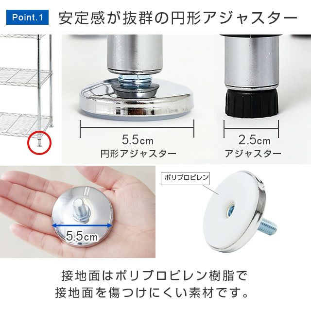 | 材質 | スチールシェルフ(棚板)・ポール:スチール(クロームメッキ) スリーブ:ABS樹脂 テンション部分:ポリプロピレン・ABS樹脂 |