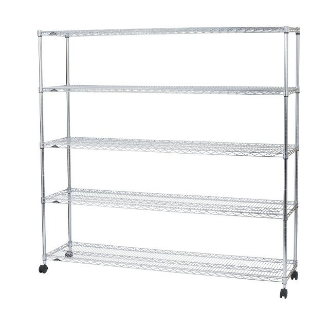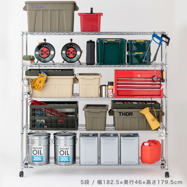 | セット内容 | スチールシェルフ(棚板)×5枚 スリーブ(棚板取付用部品)×20組 ポール×4本 ナイロンキャスター(ストッパー付)×2個 ナイロンキャスター(ストッパーなし)×2個 標準アジャスター×4個 スパナ×2個(キャスター取付用) |
