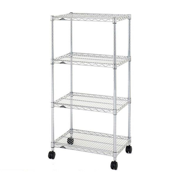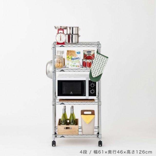 | 材質 | スチールシェルフ(棚板)・ポール:スチール(クロームメッキ) ナイロンキャスター:ナイロン樹脂 スリーブ:ABS樹脂 |