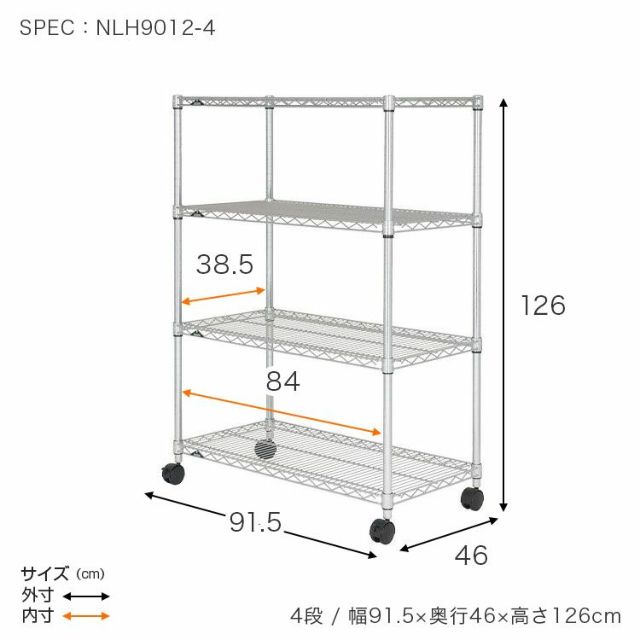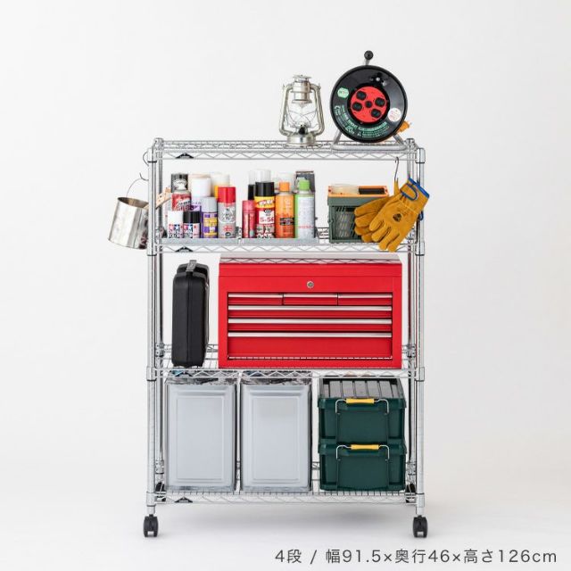| セット内容 | スチールシェルフ(棚板)×4枚 スリーブ(棚板取付用部品)×18組 ポール×4本 ナイロンキャスター(ストッパー付)×2個 ナイロンキャスター(ストッパーなし)×2個 標準アジャスター×4個 スパナ×1個(キャスター取付用) |