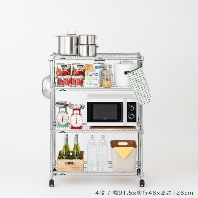 | 材質 | スチールシェルフ(棚板)・ポール:スチール(クロームメッキ) ナイロンキャスター:ナイロン樹脂 スリーブ:ABS樹脂 |