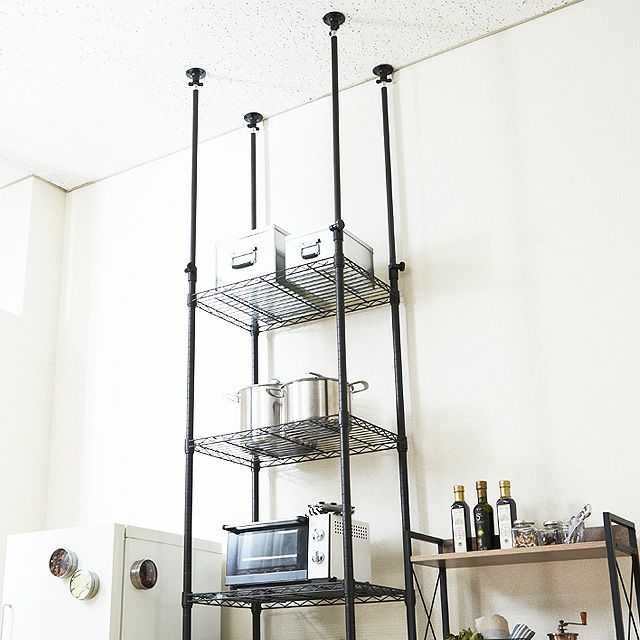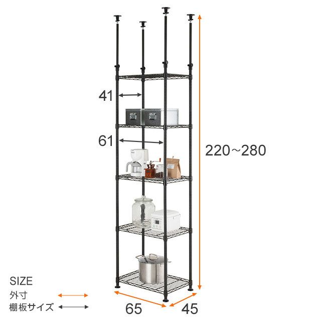 シェルフ×5枚 ポール(3分割タイプ:テンションポール・中部・下部)×各4本 スリーブ×20組(予備1組) 円形アジャスター×4個 ネジ(テンションポール「天井押し当て部」に使用する部品です)×12本 ワッシャー(テンションポール「天井押し当て部」に使用する部品です)×12枚 |