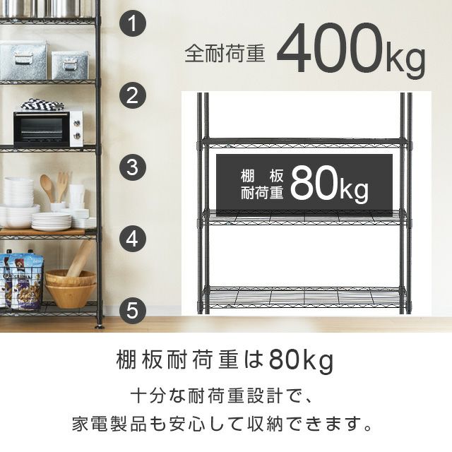 棚板1枚当たり:約80kg ※値はシェルフ全面に均等に荷重をかけた場合の値になります。