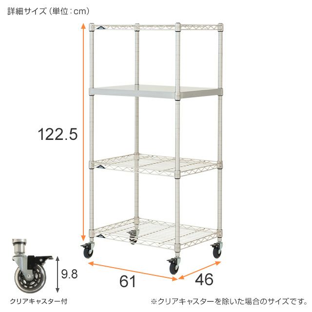 | セット内容 | スズメッキ ワイヤーシェルフ(棚板)×3 スズメッキ ソリッドシェルフ(棚板)×1 スリーブ(棚板取付用部品)×16 スズメッキ ポール×4 クリアキャスター×4 |