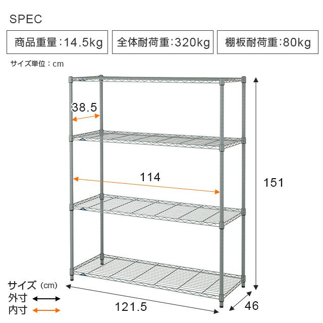 スチールラック 幅120cm 4段 幅121.5×奥行46×高さ151cm ルミナスEX グレー EX25-124GY