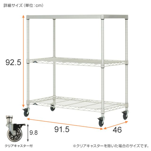 セット内容 | スズメッキ ワイヤーシェルフ(棚板)×2 スズメッキ ソリッドシェルフ(棚板)×1 スリーブ(棚板取付用部品)×12 スズメッキ ポール×4 クリアキャスター×4 |
