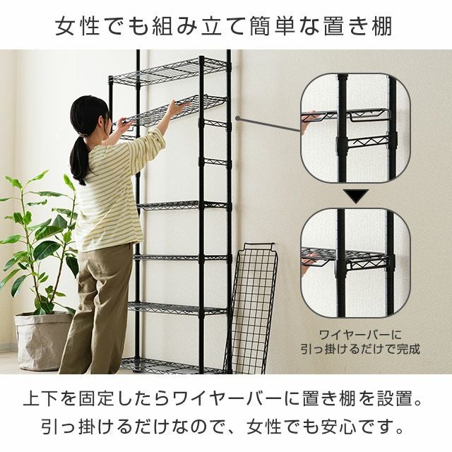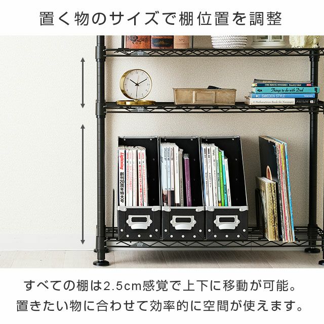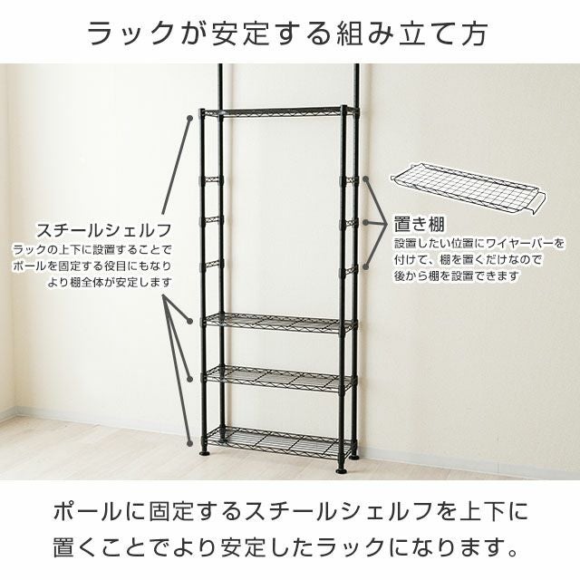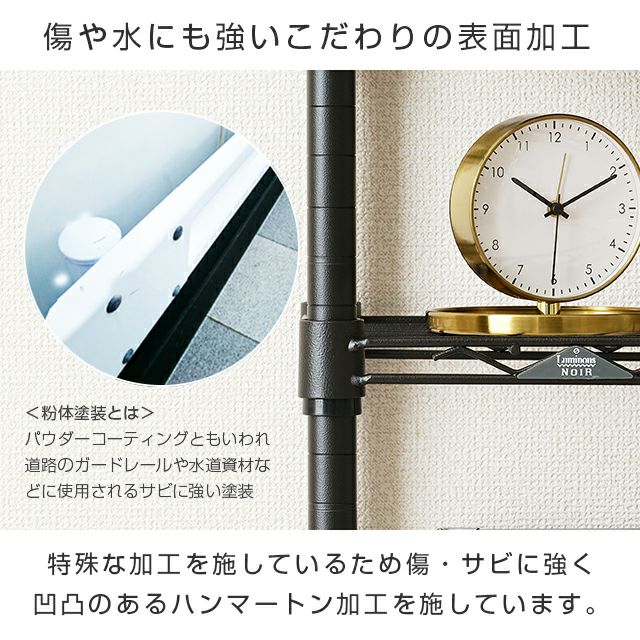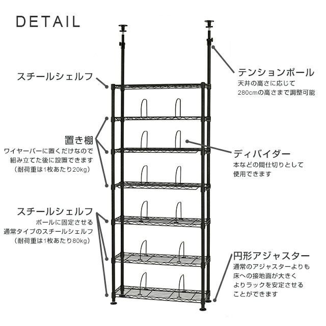 スチールシェルフ(棚板)×4 置き棚×3 ワイヤーバー×6 ディバイダー×12 スリーブ(棚取付用部品)×30(予備2) ポール×10(※前側ポール:2分割タイプ、後ろ側ポール:3分割タイプ) 円形アジャスター×4 ネジ×6 |