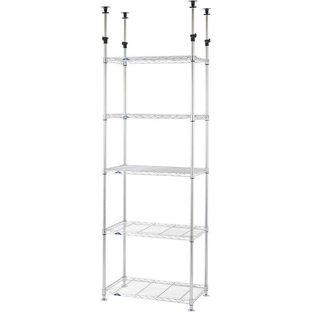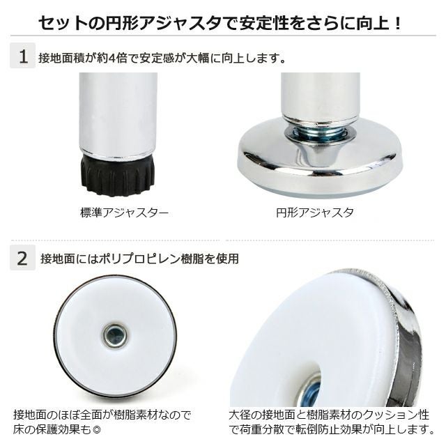 | 材質 | スチールシェルフ(棚板)・ポール:スチール(クロームメッキ) スリーブ:ABS樹脂 テンション部分:ポリプロピレン・ABS樹脂 |