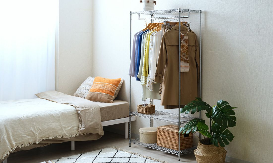 衣類収納には、風通しの良いオープンラックがおすすめ。ハンガーポール+棚板の併設で「掛ける」と「置く」を両立し、トップスは掛け、ニット・帽子・バッグは棚にすっきり。高さ調整で子ども用に低く設定できたり、ポール延長で高さを出してロングコートもシワなく収納。