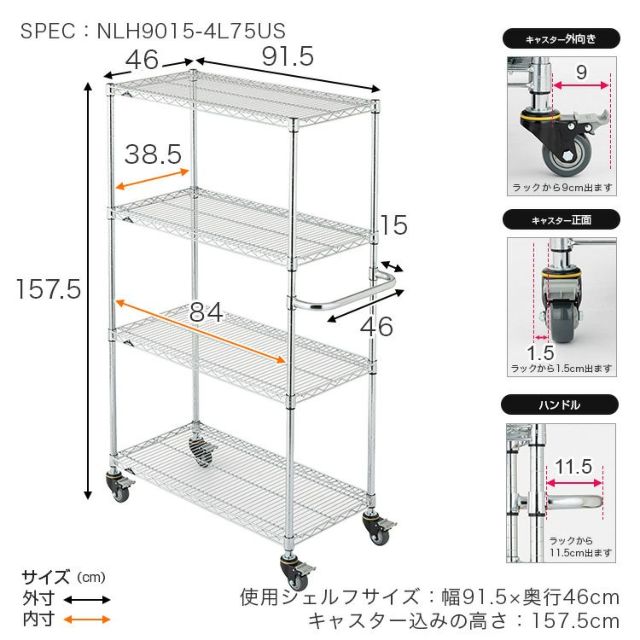 (棚板のみ)幅91.5×奥行46×高157.5cm (ハンドル含む)幅103×奥行46×高157.5cm |