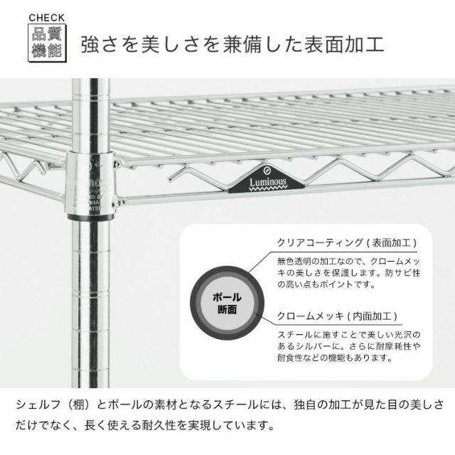 本体:スチール(クロームメッキ) 高耐荷重キャスター:取り付け部/スチール・キャスター/ウレタン スリーブ:ABS樹脂 |